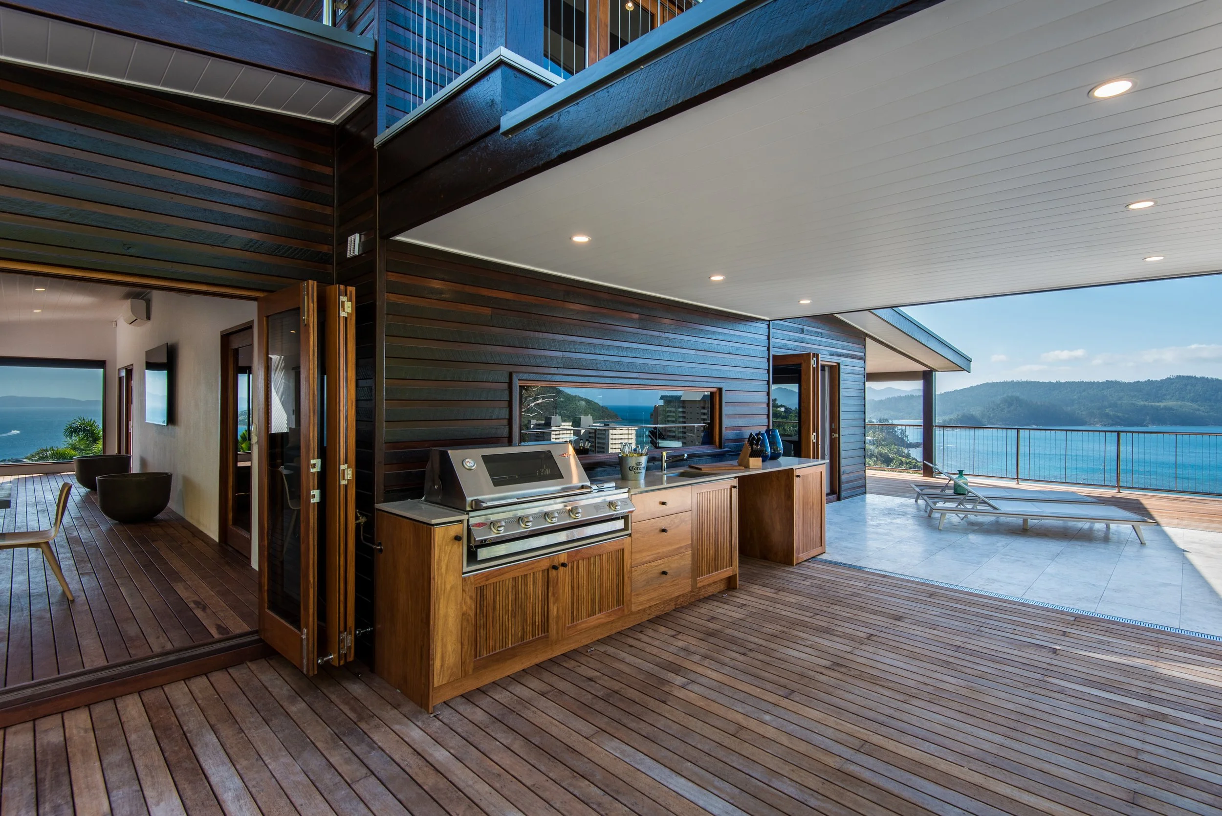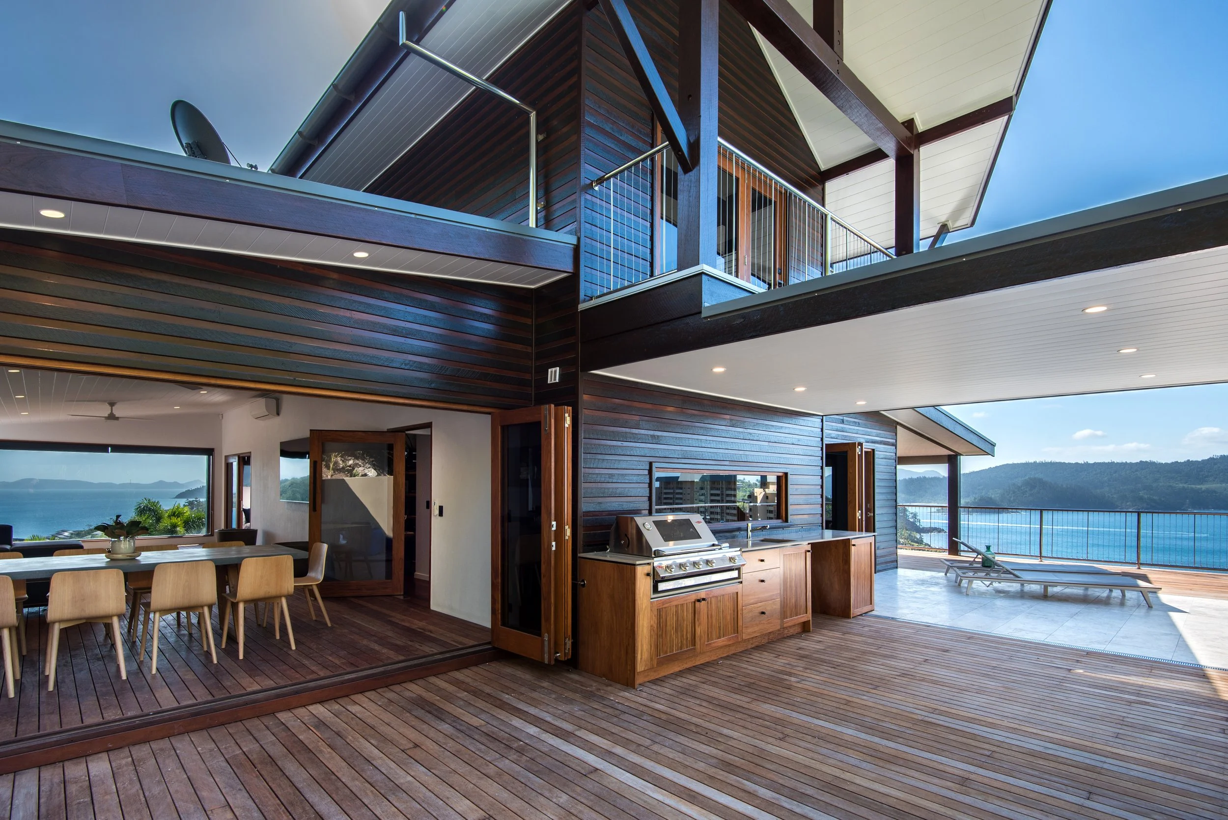 Horizons is the epitome of luxury, spanning three opulent levels with polished timber flooring and expansive sliding doors that open to outdoor terraces, complete with plush sun lounges. The modern fittings and sleek louvered windows enhance the home's design, perfectly complementing Hamilton Island's stunning climate.